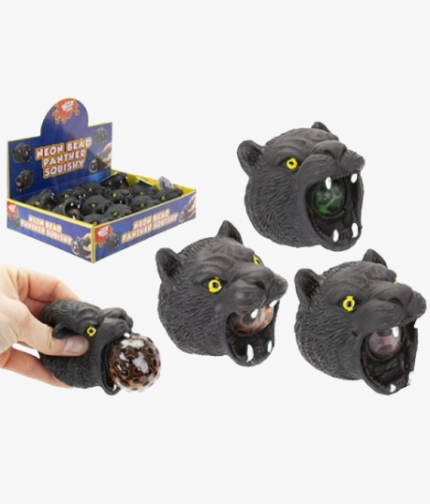 Black panther squishy with neon coloured beads that protrude through the mouth when squeezed. Ideal stress reliever. Striking panther head.